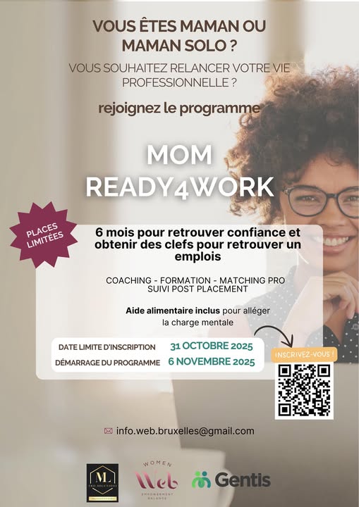 Pour les mamans ou mamans solos résidant à Bruxelles qui envisagent de reprendre une activité professionnelle.Vous êtes maman ou maman solo désireuse de relancer votre vie professionnelle ? Le programme de coaching et formation MOM READY4WORK est fait pour vous.
